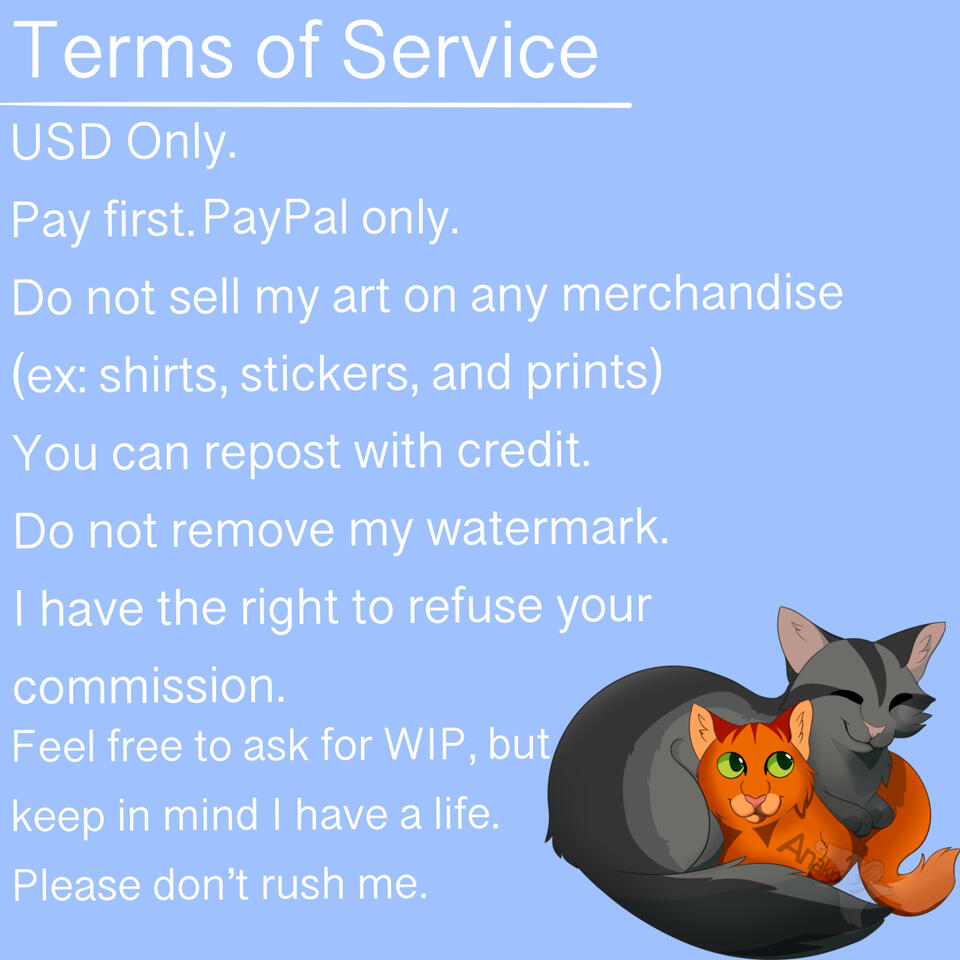 Payment methods can only be through PayPal. Clients that know me IRL can pay through Venmo or pay with cash. USD only! When you buy a commission from me please message me a reference picture and what type of commission you want. Please give me a precise reference photo of the subject you wish to. After you receive your commission do not sell it on prints, stickers, or other merchandise. If you would like a print, let me know! I will be more than happy to print it and mail it to you. Getting a print will cost a little extra. ALL SALES ARE FINAL! If I need to cancel your commission, I will give you a full refund. If you want a refund it will depend on which stage of the drawing I'm on. If I'm still on the sketch, you get a full refund. If I'm on the line art, you will get a 50% refund. If I'm on the shading or color part you will not be able to get a refund. I'm sorry