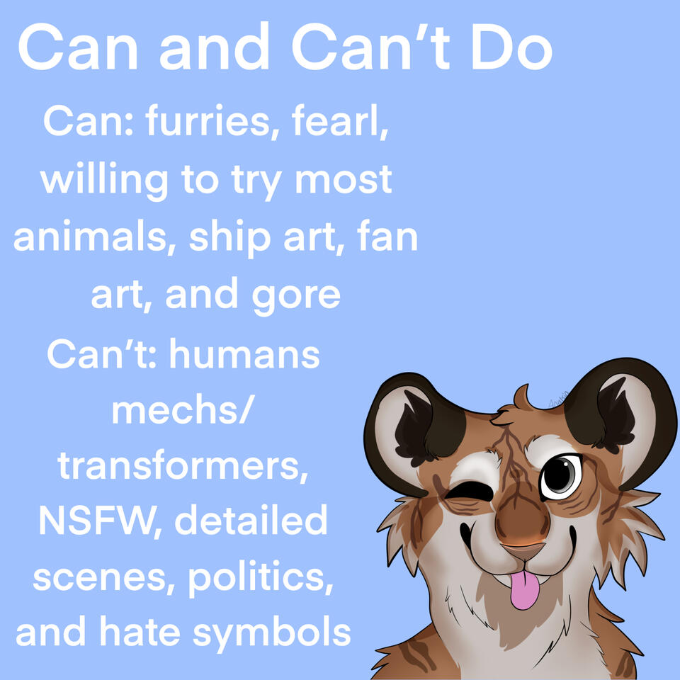 I have limitations and I'm trying to over come them. I'm willing to do simple scenes and experimental commissions. I'll do fan art, but if I don't like the fandom I will likely say no (sorry). I can do meme art. If you want your character in a certain meme, I will be more than happy to draw them for you. Please keep in mind that I am a Christian artist and will not draw anything satanic related. Things like Helluva Boss are fine. If you have anything you want me to draw that is not on this list please message me and ask!
